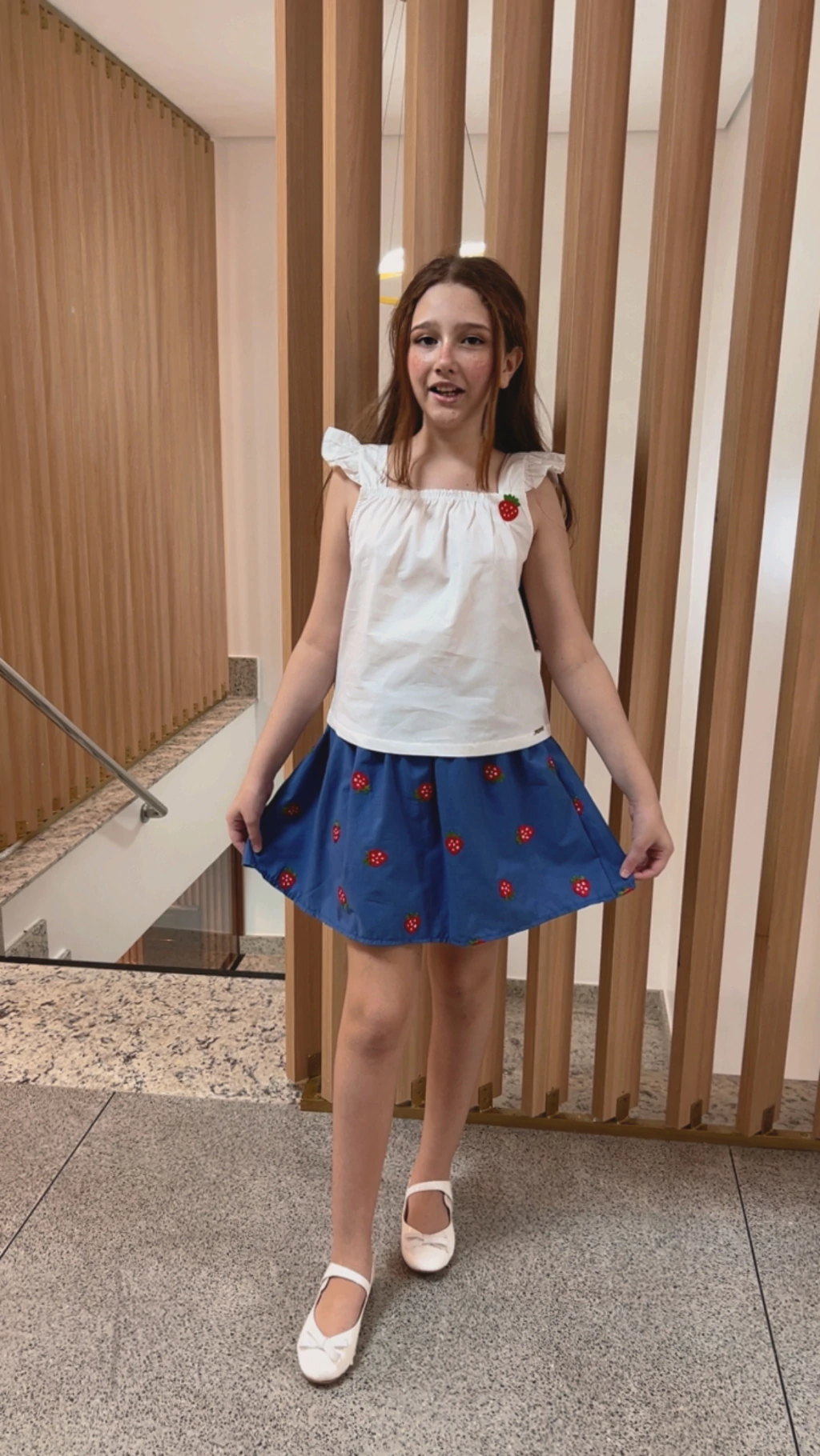 Temos uma blusa branca com alcinhas delicadas e aplicação de moranguinho, uma saia azul com bordadinhos de morango, sapatilhas vermelhas e laço combinando — um look cheio de doçura e estilo!