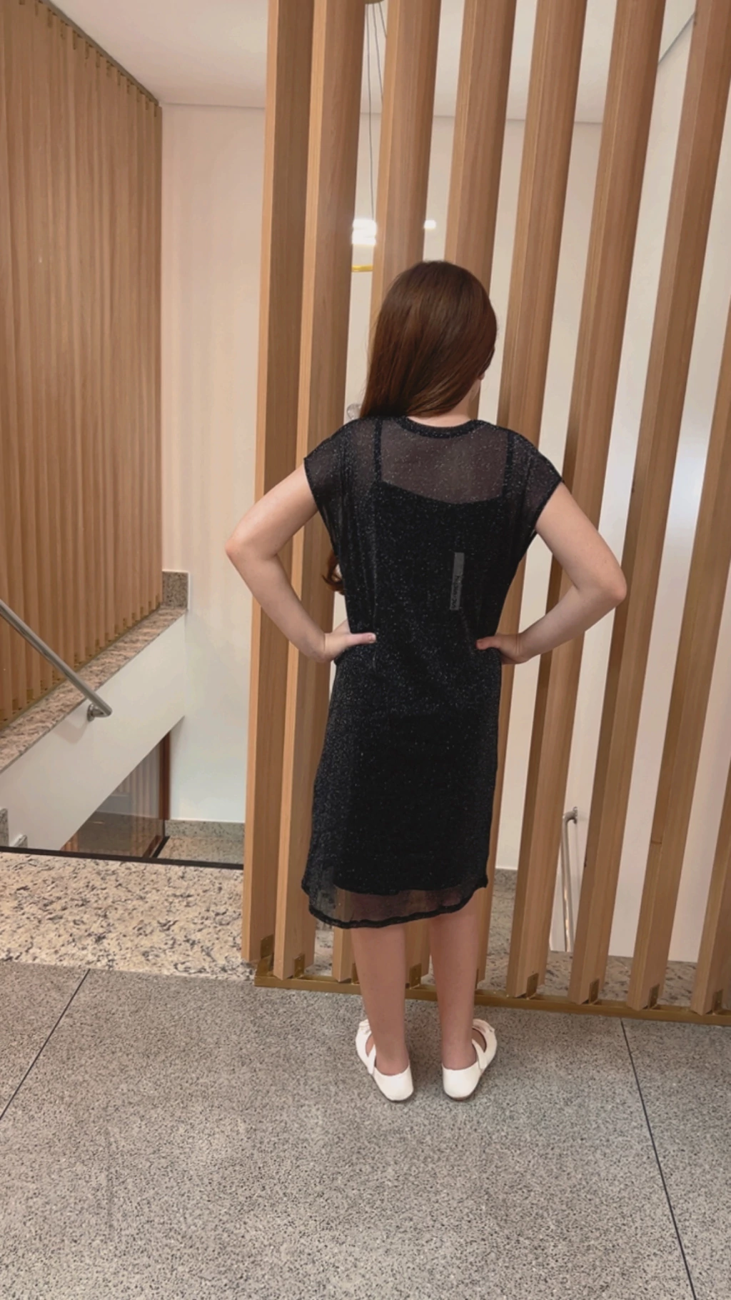 Descubra a magia deste vestido em malha com tela em tule, uma combinação perfeita que traz leveza e charme para ocasiões especiais. Confeccionado com atenção aos detalhes, ele oferece um caimento delicado e confortável, ideal para quem busca elegância com um toque moderno.